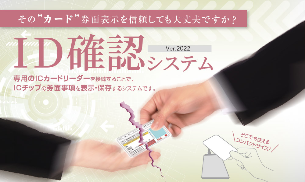 ID確認システムは、偽変造カードの作成が極めて困難なICチップ登録内容の確認を行うことで、本人確認作業の高精度化をサポートするシステムです。