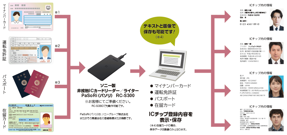 - マイナンバーカード/IC運転免許証/ICパスポート/IC在留カードに対応