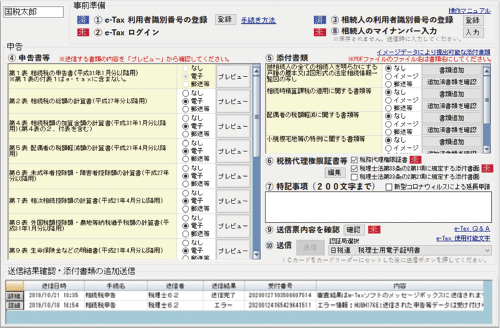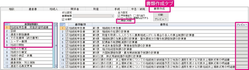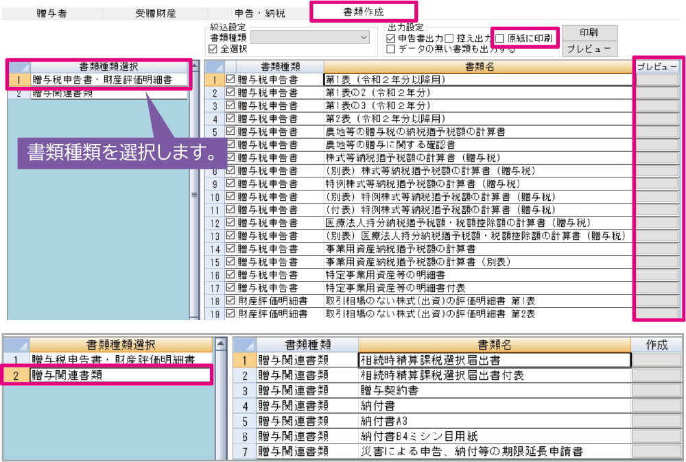 受贈財産タブや申告・納税タブで入力した情報を基に申告書を出力します。