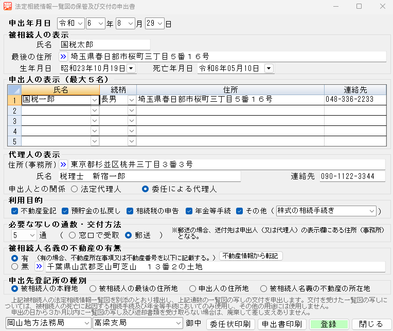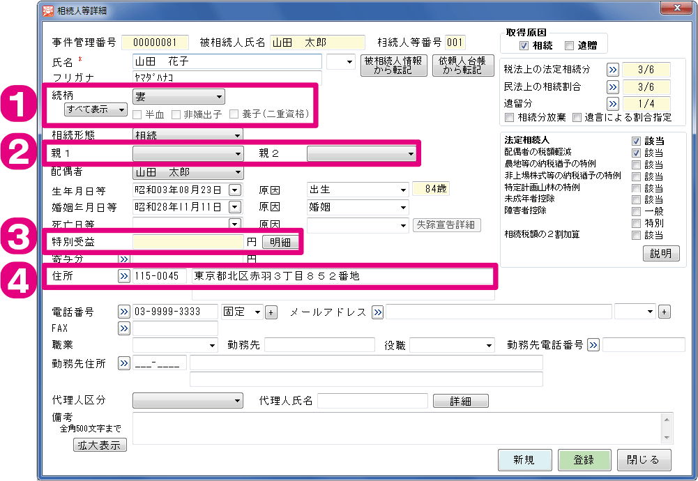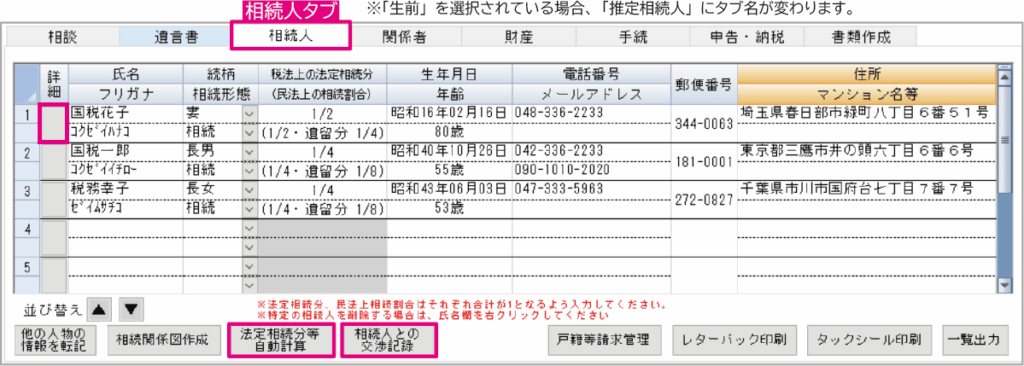 続柄、兄弟間の相続における全血・半血、非嫡出子、代襲相続人が被相続人の養子であるように身分を併有する場合(二重資格) の有無、相続放棄や廃除といった登録情報を基に民法上の相続割合と相続税計算上の法定相続分を区別して自動計算(S23.1.1 以降の相続に限る。) することができます。