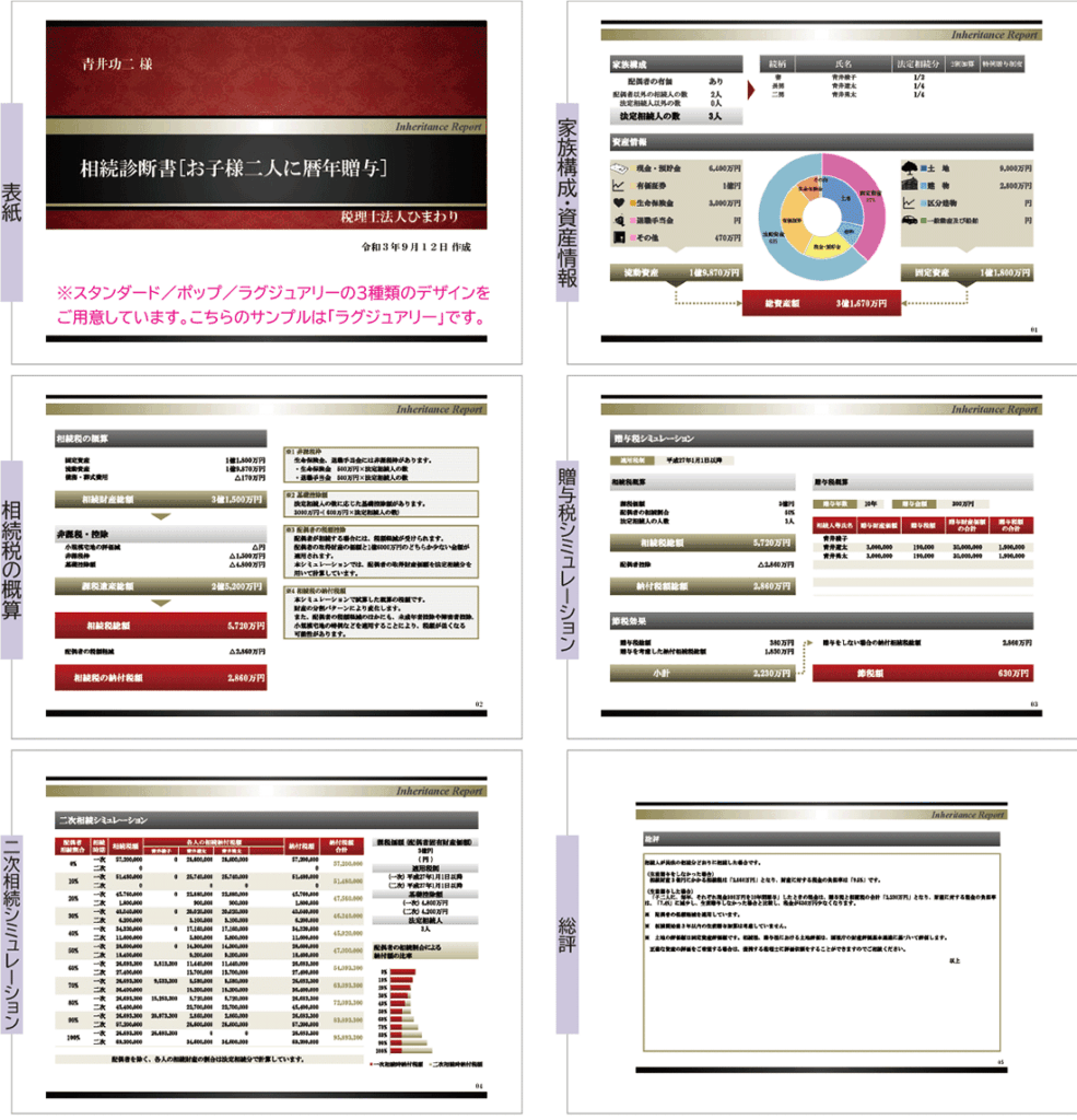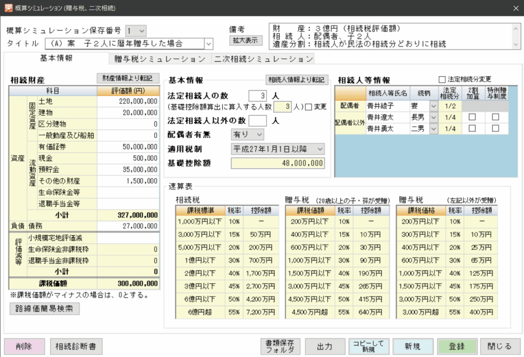 - 暦年贈与した場合の節税効果と二次相続を考慮したシミュレーションを相続診断書に反映することができます。さらに、「小規模宅地減額」及び「財産分割」の各シミュレーションの内容をも反映させることができます。
