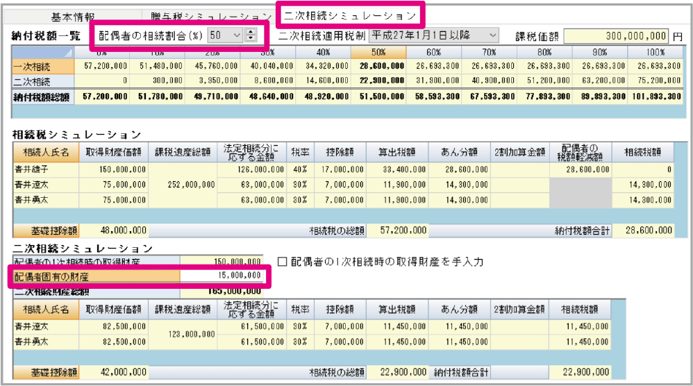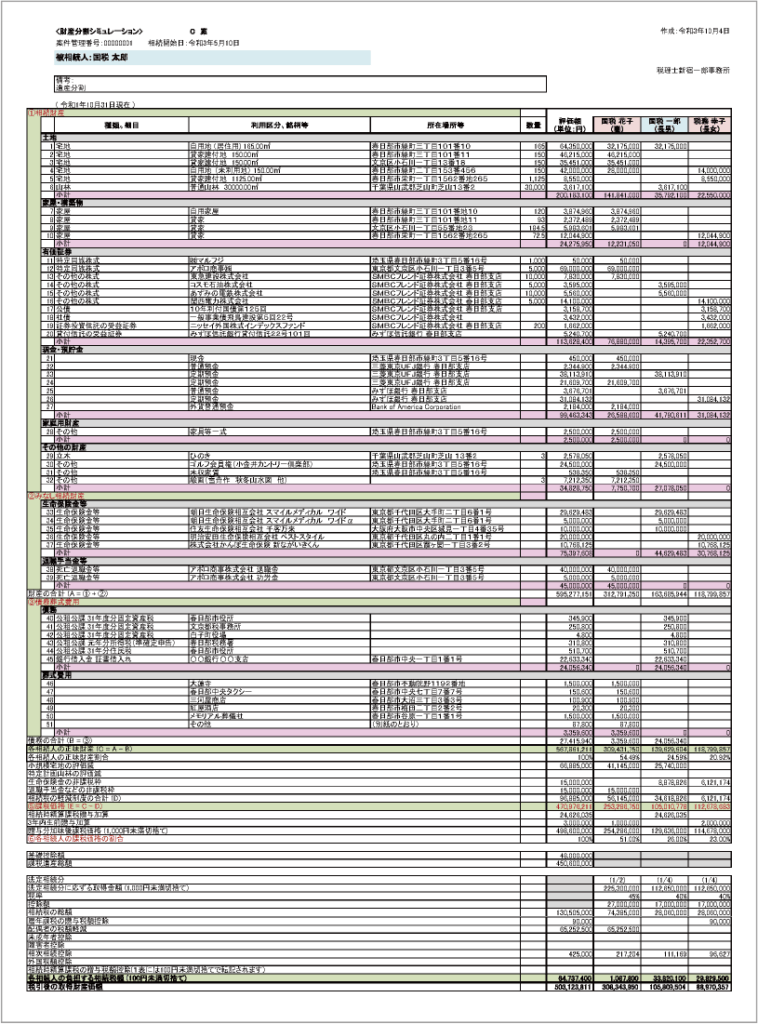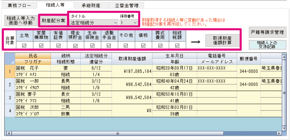 財産の配分案を計算 各相続人等の取得財産価額を一覧表示