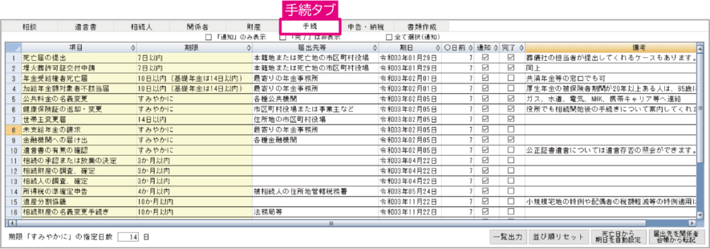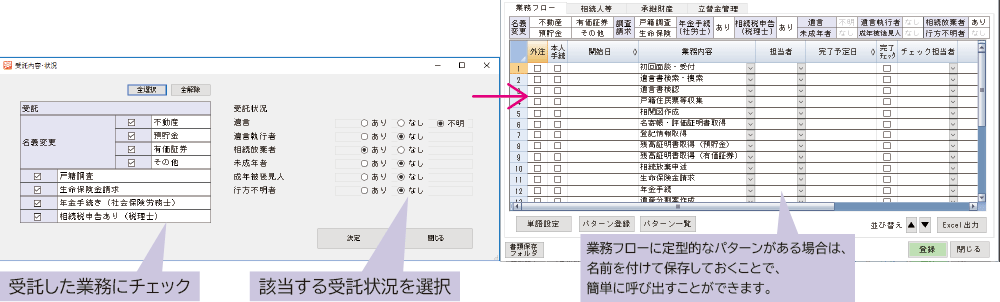 業務フローが自動生成されたら、これを利用して遺産承継業務全体の進捗管理を行います。必要な他の情報(開始日、担当者等)を順番に登録していきます。