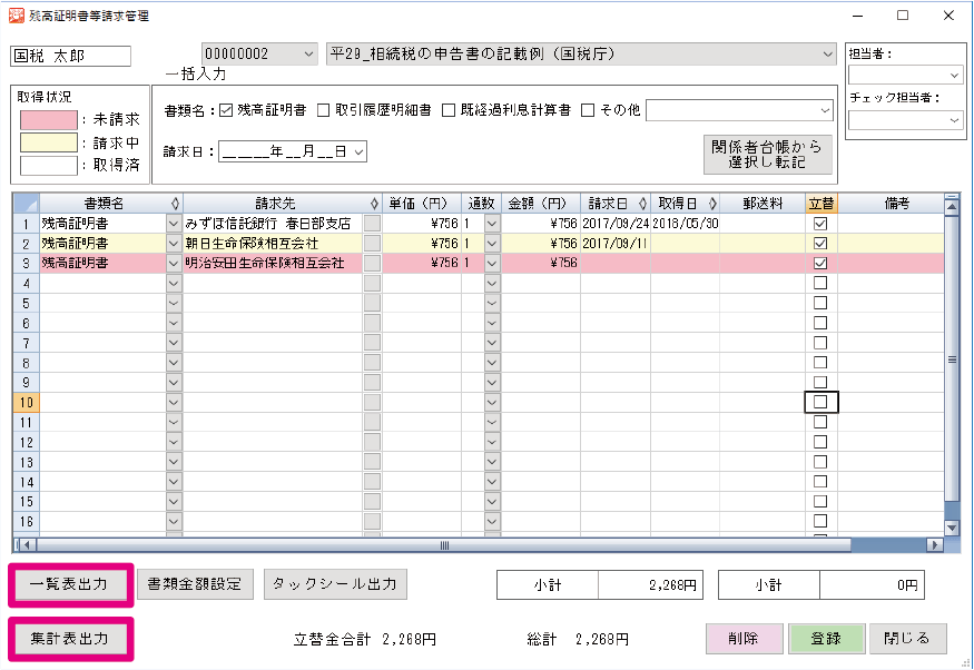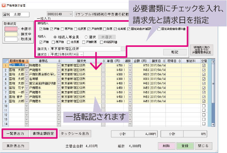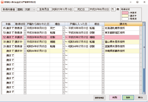 相続人ごとに、戸籍謄本や印鑑証明書等の公的書類の取得の有無、かかった金額等を管理する画面です。請求日・取得日の入力状況によって、取得状況を色分け表示し、ひと目で請求状況が把握できます。