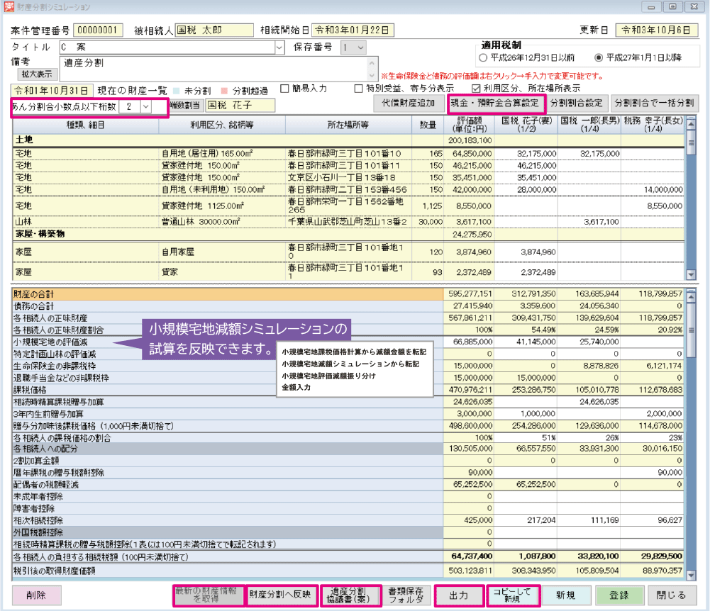 “相続税申告の有無”、“暦年贈与した場合の節税効果”、“二次相続”の考慮はもちろん、”小規模宅地減額シミュレーション”、”財産分割シミュレーション”の結果が反映できます!
