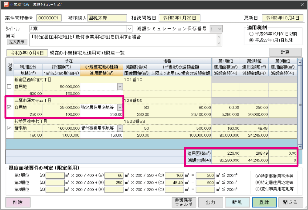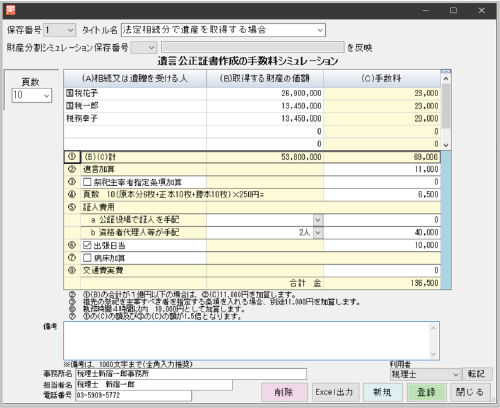 タイトル、保存番号をつけて複数登録可能のため、配分案ごとに各相続人等の取得財産価額がいくらになるかを切り替えて確認することができます。