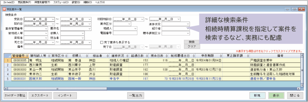 - きめ細かい検索条件で当該案件を素早く確認 → ダブルクリックで案件台帳に遷移します。