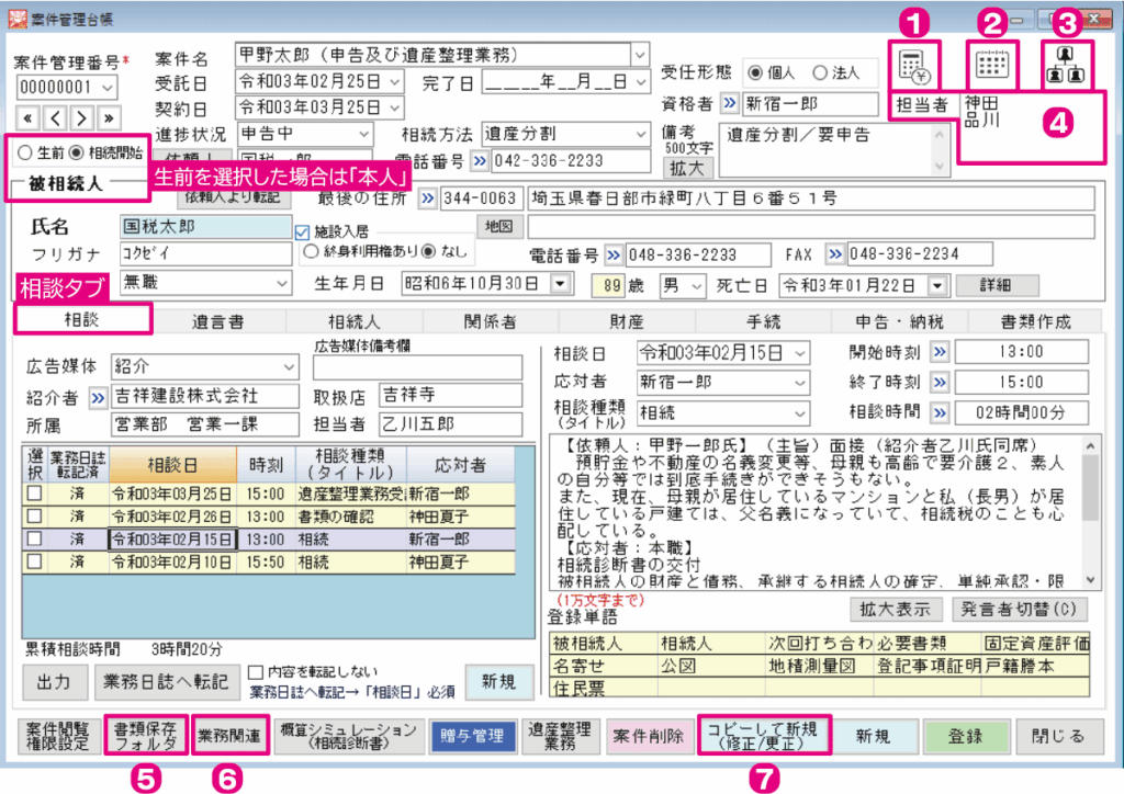 電話やメールによる問い合わせ、面談の内容を記録して管理します。「生前」と「相続開始」はワンクリックで切り替え可能。もちろん生前のデータはそのまま活用できます。