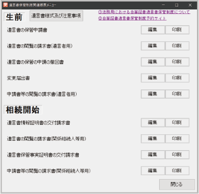 法務局における遺言書保管制度(令2.7.10 施行) に係る「遺言書の保管申請書」をはじめ、各種帳票が作成できます。遺言書様式及び注意事項の確認、予約サイトへのリンク機能を設けています。