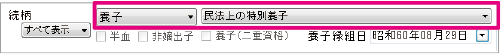 「養子」「養女」を選択した場合にのみ、下図のようなサブメニューが表示されます。半血、非嫡出子、養子(二重資格) 欄は、必要な場合にのみチェックが可能になります。