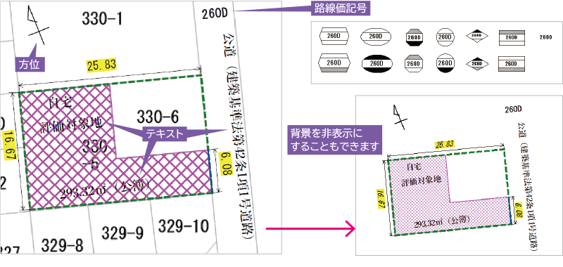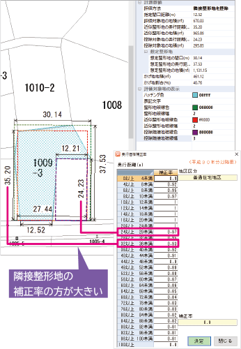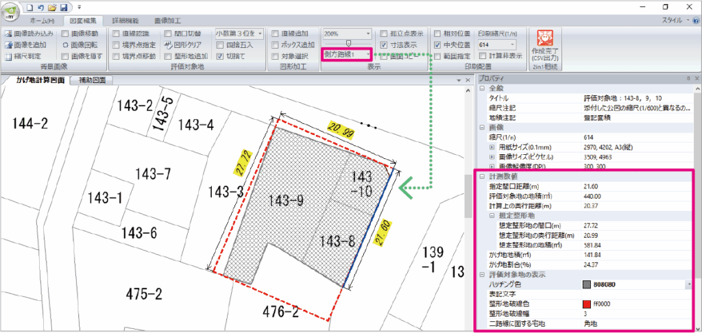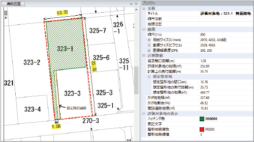 プロパティ欄で「角地」「準角地」「角地としての効用を有しない」の区別可