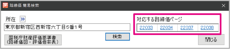 所在を入力し、検索ボタンを押すと路線価ページの候補が表示されます。路線価を確認し、面積を乗じて土地の評価額欄に入力するだけ!