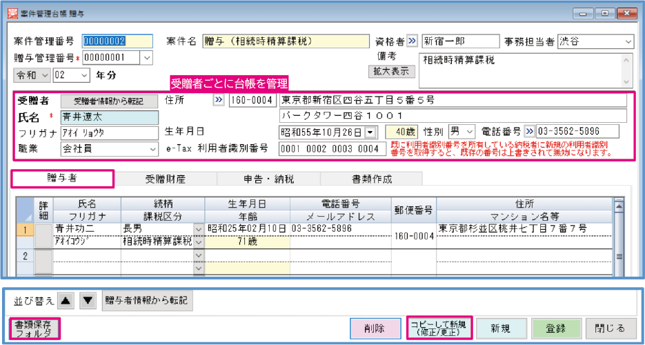 - コピーして新規案件を作成できるので、毎年同じ内容の贈与を繰り返す場合に便利です。また、修正申告にも対応しています。