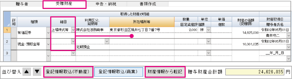- 登記情報提供サービスから不動産情報(PDFファイル)を取得し、受贈財産一覧に転記できます。