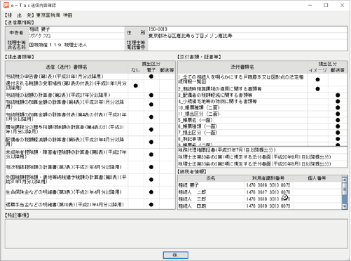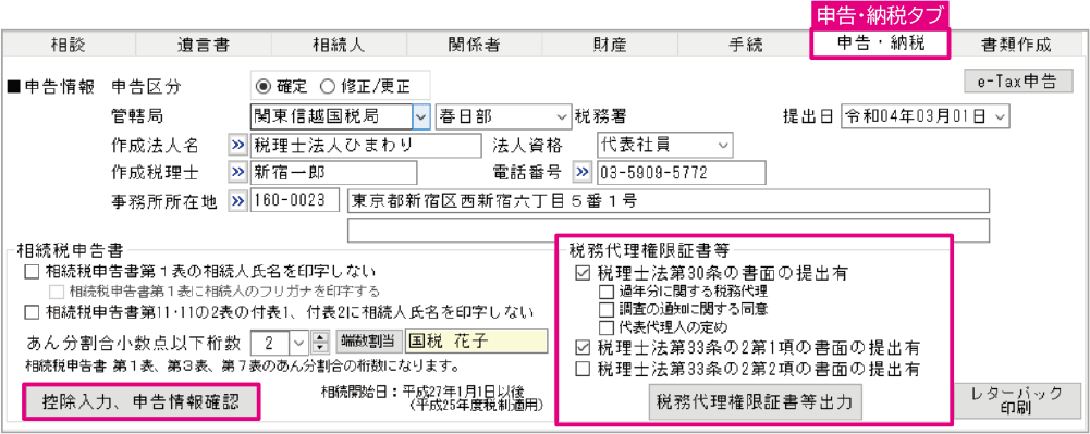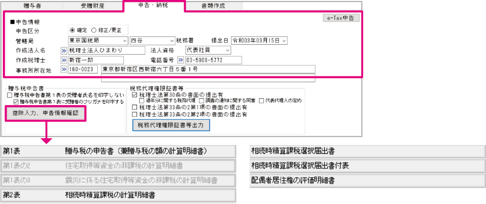 申告先の管轄局税務署の設定や提出日、控除入力・申告情報の確認、代理権限証書の作成をするタブです。管轄局は、受贈者の住所を入力するとシステムが自動で入力します。作成税理士は登録されている税理士を選択すると、 電話番号、事務所所在地も同時に入力されます。