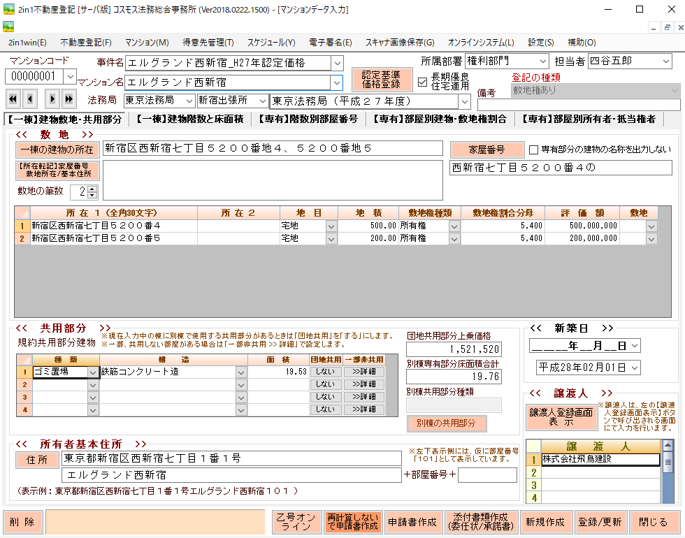 一棟の建物の所在、マンション名称、敷地権の表示、譲渡人の情報を入力します。