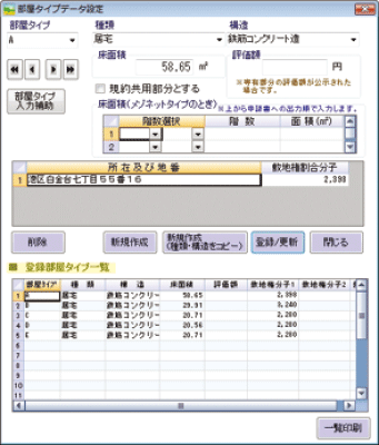 各部屋の情報を入力します。附属建物の入力もこの画面で登録します。メゾネットタイプにも対応。