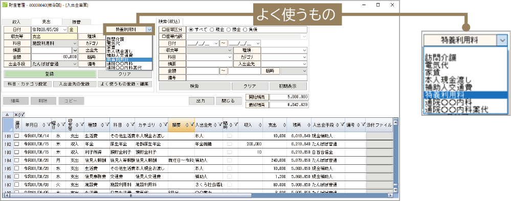 よく使うものを登録することで、収入、支出、振替の入力を簡便化します。会計や簿記の知識がなくても、簡単に作業ができます。