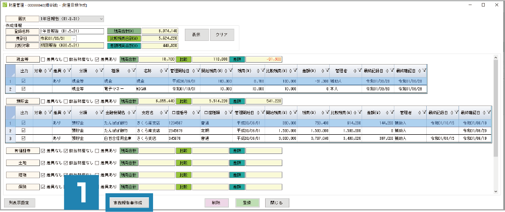 また、特定の時点を比較し、財産の増減の確認も瞬時に可能です。