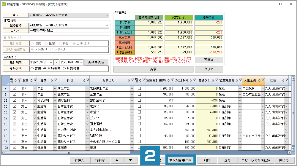 ①家庭裁判所に報告する財産目録も、画面で集計結果を簡単に確認することができます。またボタン1つで、家庭裁判所の財産目録にデータを出力することも可能です。また、収支状況報告書も集計結果を簡単に確認することができます。 ボタン1つで、家庭裁判所の収支状況報告書に出力が可能です。
