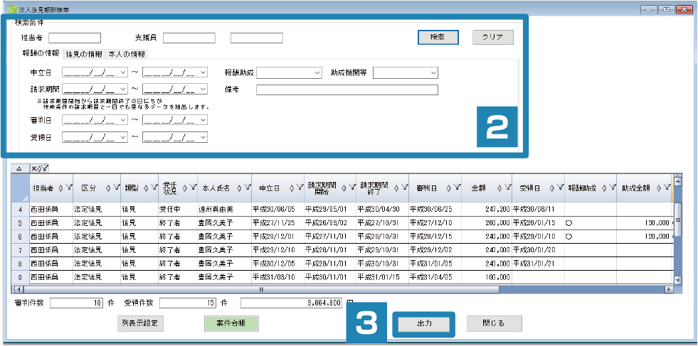 - 検索結果はエクセルで一覧出力できますので、受任ケース一覧、家裁報告月一覧、準備中ケース一覧などを簡単に作成できます。集計表をあらかじめエクセルで用意しておくことで、希望の集計を簡単にすることができます。