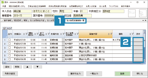 - 「法人後見実施一覧」タブには、法人後見支援員が支援した情報(支援日、支援時間、支援員名、支援内容等)を入力します。担当した法人後見支援員が、地域から採用した支援員の場合には、別の画面で、賃金や通勤手当の情報を入力し、集計することができます。