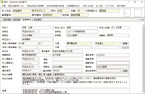 後見等開始申立てから審判に至る進捗状況把握が円滑化、親族調査・2親等親族図作成・申立費用の支出管理等の事務が管理できます。