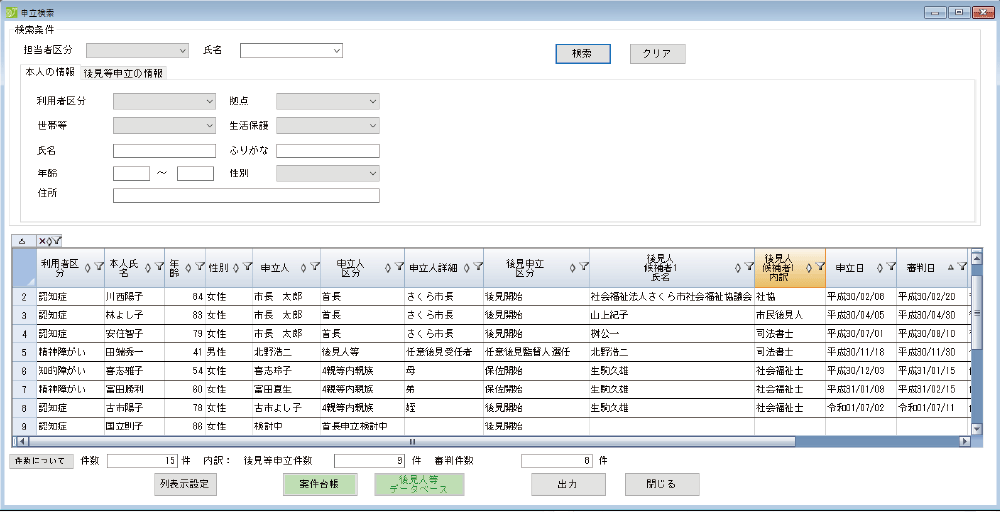 後見人等候補者の情報は、「後見人等データベース」を呼び出して入力も可能です。(直接入力も可能)また、管理・集計したい任意のデータも登録が可能です。