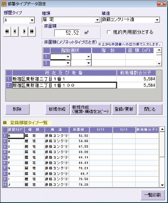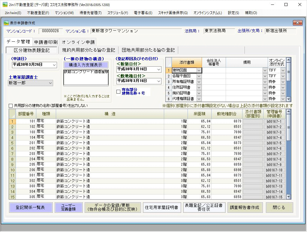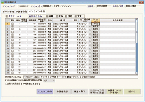 申請書は1棟まるごとでも部屋ごとでも作成することができ、オンライン申請用の申請書も100戸でも200戸でもボタンをクリックするだけです。共用部分の敷地権割合を0で申請する こともできます。