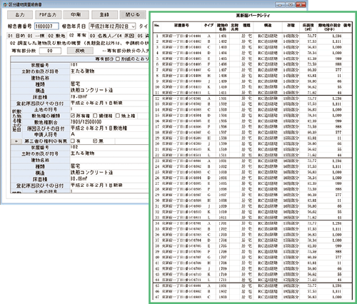 マンション一棟の調査報告書を入力したデータを基に作成します。専有部分の出力も同じタイプごとに出力しますので、家屋番号毎にチェックをするのではなく、部屋タイプ毎に確認することで時間を短縮することが出来ます。また、別紙のとおりとして別紙用の一覧も作成できます。