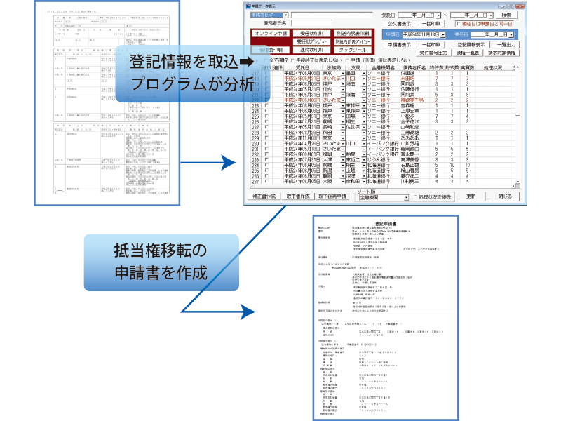 登記情報の抵当権者を判別し、申請書や委任状を作成します。順位が複数ある場合、移転済の登記がある場合には注意喚起のメッセージを表示するなどの機能も充実しています。 また、申請先や金融機関などを考えず、選択して申請ボタンをクリックするだけで、自動で連件で申請できます。