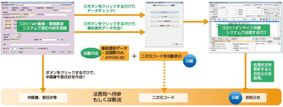 データを入力後、申請データ作成ボタン1つクリックするだけで、【法務省】申請人プログラムを起動し、2in1システムが自動でファイルを指定します。